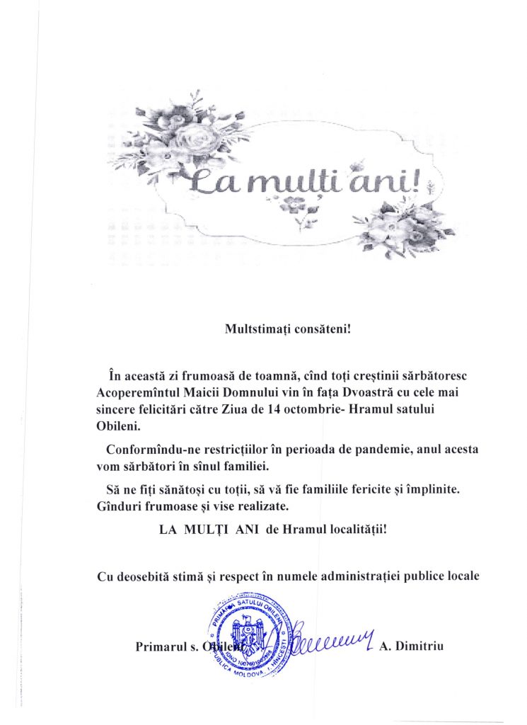 Felicitare cu ocazia hramului satului Obileni