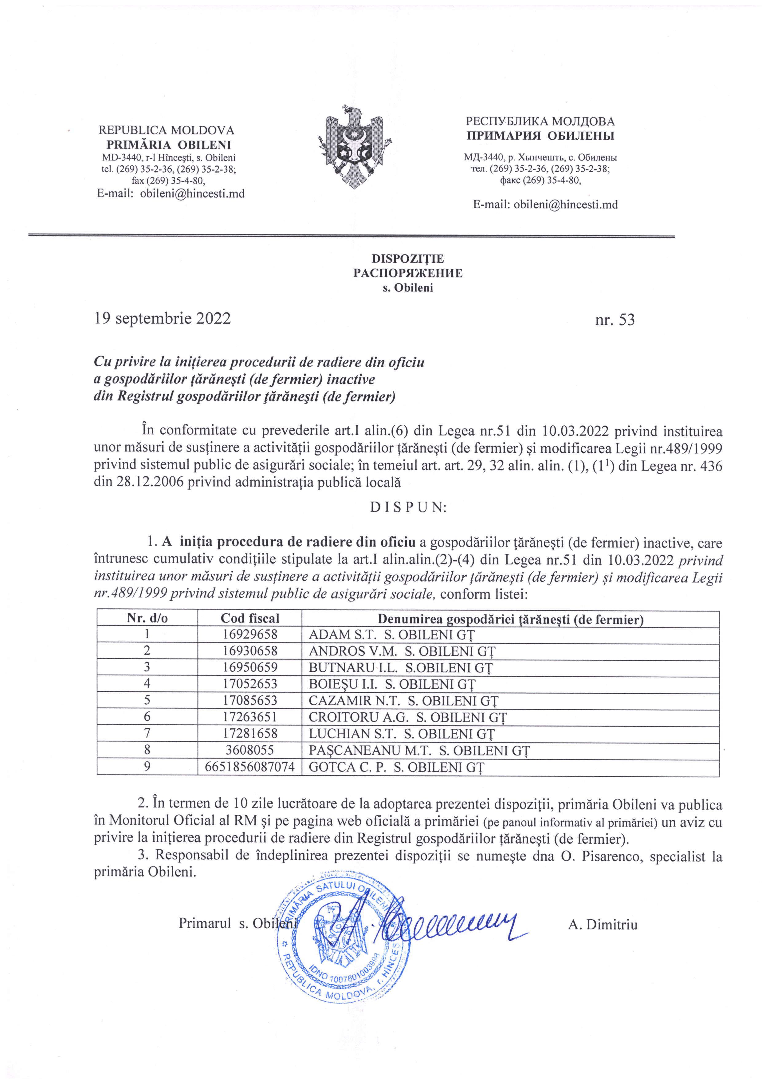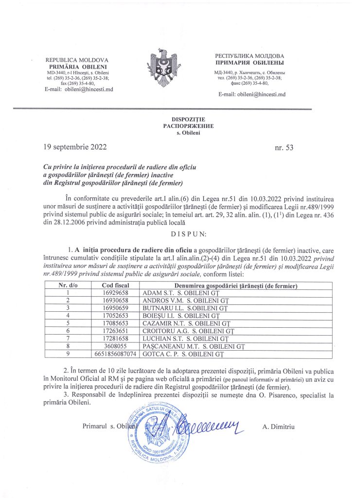 Inițierea procedurii de radiere din oficiu а gospodăriilor țărănești (de fermier) inасtivе
